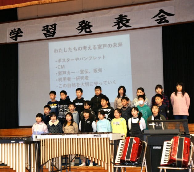18日、市立室戸小学校の体育館。全学年が1年間の総合学習の公開発表会に臨んだ。4…