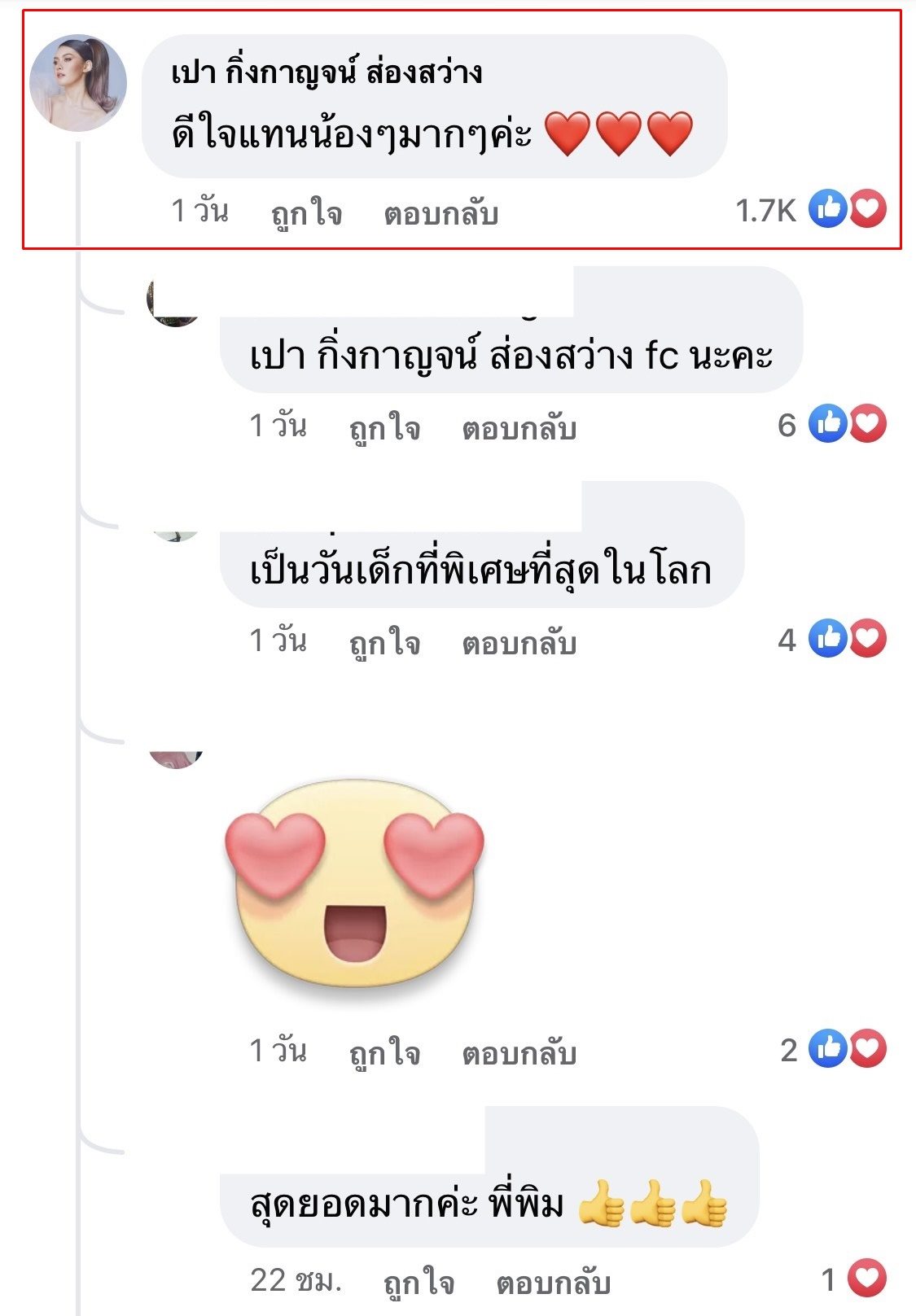 “ใช่ค่ะ ส่วนตัวหนูคือหนูชอบพี่เขา แต่ถ้าจะลามไปถึงเรื่องอื่นเราขอไม่สนับสนุน เพราะว่าหนูอยากให้แฟนคลับของพี่เขา ซัพพอร์ตเขาดีกว่า อย่าเอาเรื่องอื่นไปใส่ให้มันใหญ่โต สงสารพี่เขา เขาทำงานไลฟ์สด หาตังมาช่วยเด็ก เขาก็ไม่ได้รู้เรื่อง คือถ้าเรารักเขาคอยซัพพอร์ตเขาดีกว่า อย่าสร้างปัญหาให้พี่เขา”