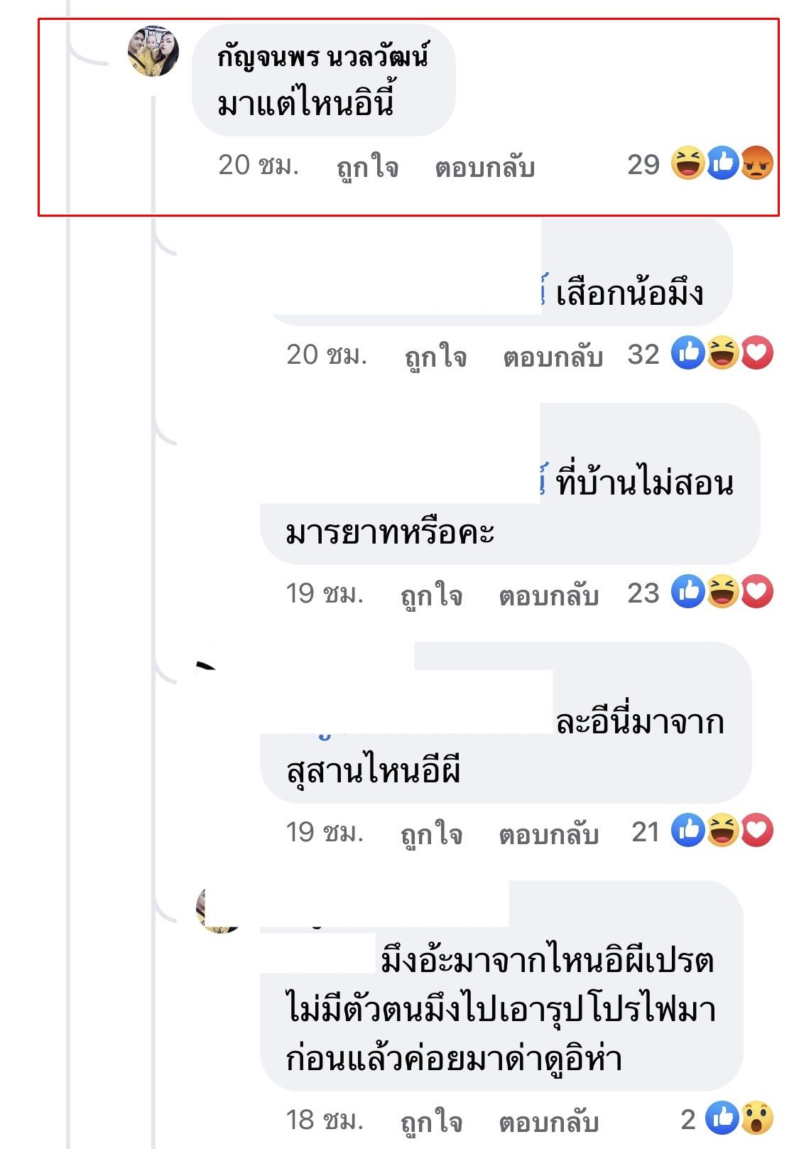 "คือเราชอบพี่พิมรี่พาย แล้วเราก็ไปคอมเมนต์ว่า "ดีใจแทนน้องๆมากค่ะ" คือเราดีใจแทนน้องๆในคลิปที่พี่เขาเพิ่งลงไปช่วย แล้วเราก็เลยไปติดตามในเพจพี่เขา แล้วไปเมนต์ ซึ่งมันมีชาวเน็ตคนหนึ่งมาด่าประมาณว่า อินี่มาจากไหน แล้วก็เหมือนว่ามีแฟนคลับเราไปด่าเขาเหมือนกันนะ เราก็เลยแบบด่ามาอีกก็ได้นะ เราจะได้ฟ้องแบบเต็มๆ เพราะว่ารูปโปรไฟล์ก็เห็นชัดอยู่ เราไม่ได้พูดจริงจังอะไร แค่หยอกๆเล่นๆ เขาก็เลยไม่ตอบมาเลย แต่ตอบคนอื่น ด่าแบบ...หืม คำแรงมาก แต่กับเราคือไม่ตอบเมนต์มาเลยนะ”