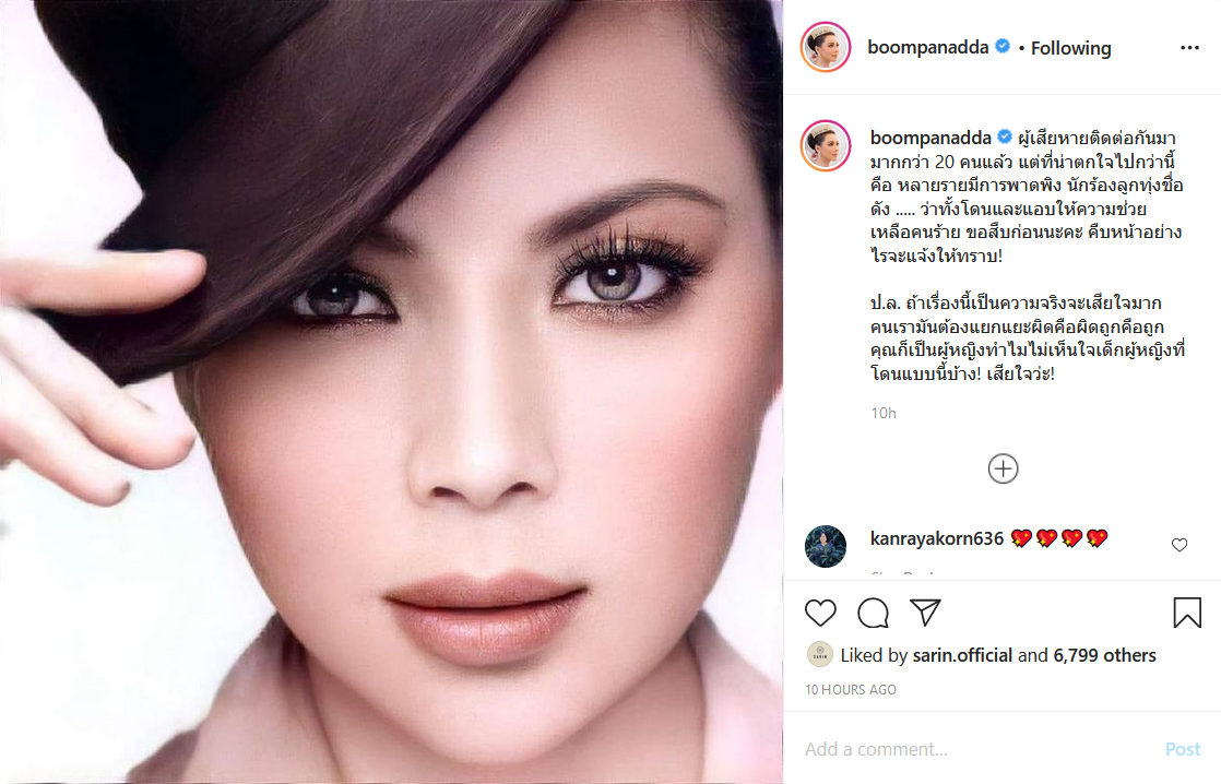 ล่าสุด สาวบุ๋ม โพสต์ภาพตนเองลงในไอจีส่วนตัว boompanadda พร้อมทั้งพูดถึงเรื่องนี้เพิ่มเติมว่าผู้เสียหายที่ติดต่อเข้ามาเพิ่มเติมบอกว่า มีนักร้องลูกทุ่งสาวเข้ามาเกี่ยวข้องด้วย โดยบอกว่า