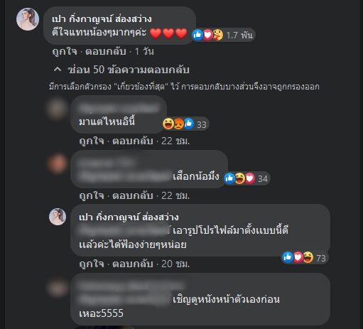 ด้าน เปา กิ่งกาญจน์ ส่องสว่าง นักร้องสาว ได้เข้าไปแสดงความเห็นในคลิปดังกล่าวของพิมรี่พาย โดยระบุว่า “ดีใจแทนน้องๆ มากค่ะ” ก่อนจะมีชาวเน็ตเข้ามาคอมเมนต์กลับว่า “มาแต่ไหนอินี้” กระทั่งแฟนคลับ เปา กิ่งกาญจน์ เข้ามาคอมเมนต์ปกป้อง