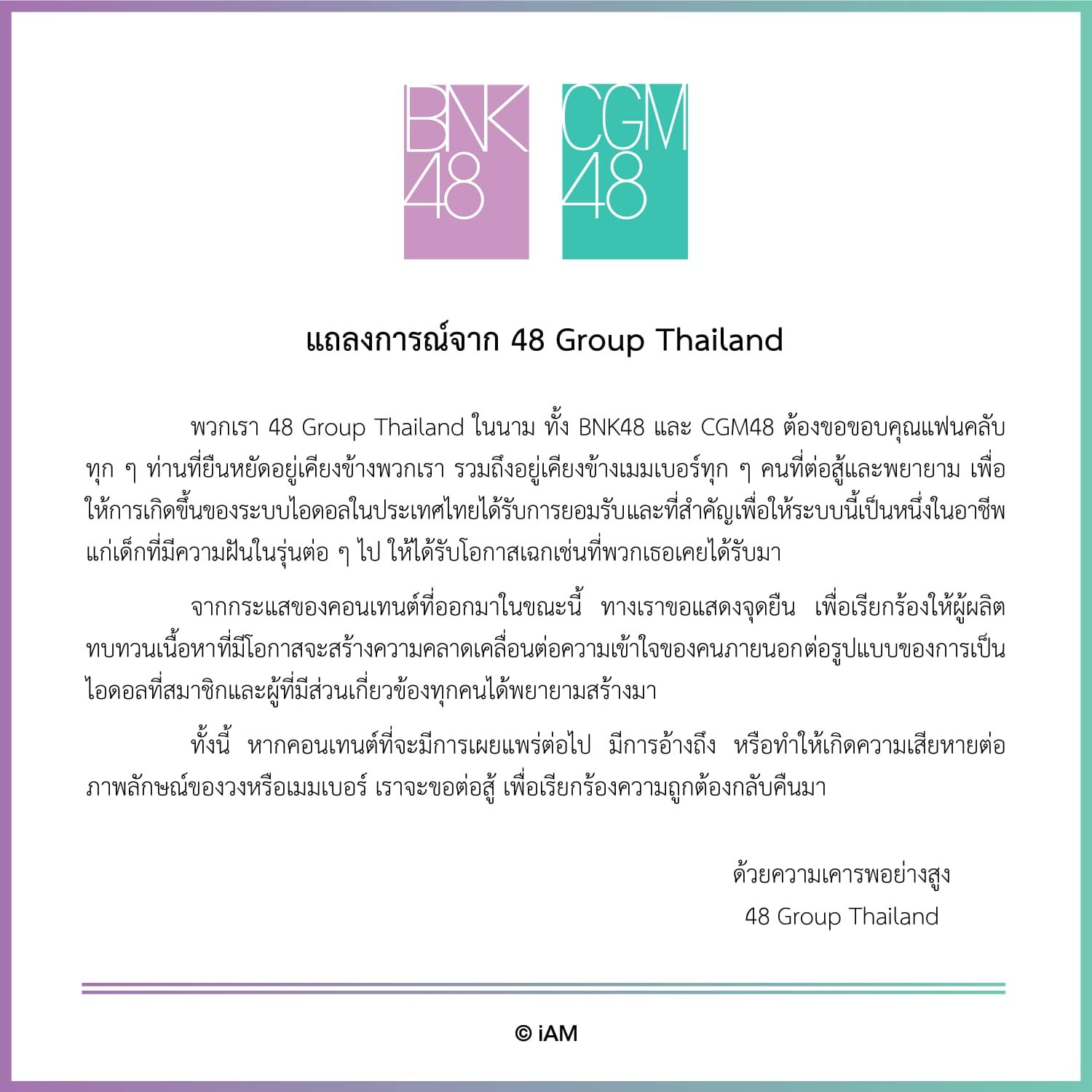 แถลงการณ์ระบุว่า พวกเรา 48 Group Thailand ในนาม ทั้ง BNK48 และ CGM48 ต้องขอขอบคุณแฟนคลับทุกๆ ท่านที่ยืนหยัดอยู่เคียงข้างพวกเรา รวมถึงอยู่เคียงข้างเมมเบอร์ทุกๆ คนที่ต่อสู้และพยายาม เพื่อให้การเกิดขึ้นของระบบไอดอลในประเทศไทยได้รับการยอมรับ