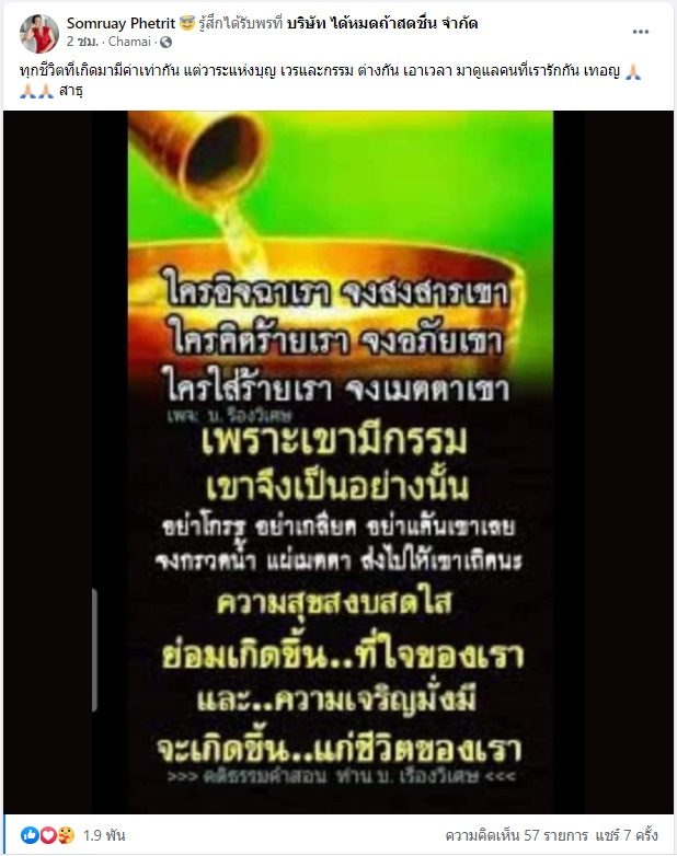 พร้อมยังคอมเมนต์ด้วยว่า “ใช้จิตใจที่ชอบตำหนิผู้อื่น มาตำหนิตัวเอง ใช้จิตใจที่ชอบให้อภัยตัวเอง มาให้อภัยผู้อื่น”