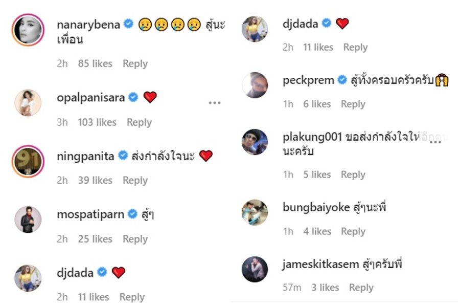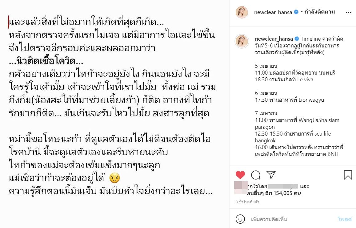 แถม เจ้าตัว มีความกังวลว่า หลังจากนี้ ใครจะดูแลลูกชาย “น้องไทก้า” เนื่องจาก พ่อกับแม่ติดเชื้อกันหมด รวมถึง น้องสะใภ้ที่มาช่วยเลี้ยงลูกชาย และอากงที่ลูกชายรักมาก ก็ติดเชื้อโควิด-19 เช่นกัน