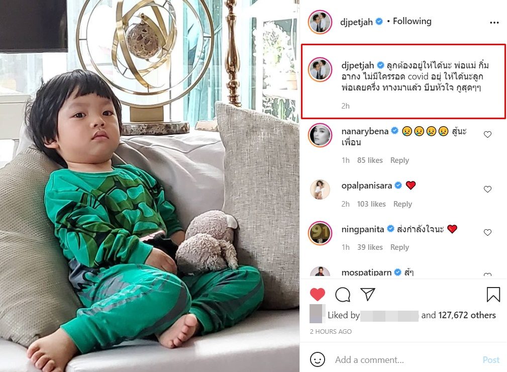 ล่าสุด ดีเจเพชรจ้า วิเชียร กุศลมโนมัย โพสต์อินสตาแกรมหลังจากทราบข่าวภรรยาติดเชื้อโควิด-19 โดยเป็นภาพของลูกชาย “น้องไทก้า” พร้อมข้อความบีบหัวใจคนอ่านว่า “ลูกต้องอยู่ให้ได้นะ พ่อแม่ กิ๋ม อากง ไม่มีใครรอด covid อยู่ให้ได้นะลูก พ่อเลยครึ่ง ทางมาแล้ว บีบหัวใจ กูสุดๆๆ”