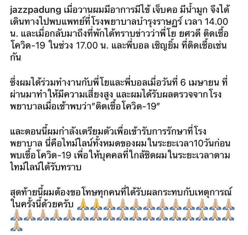 โดย แจ๊ส ระบุข้อความว่า “เมื่อวานผมมีอาการมีไข้ เจ็บคอ มีน้ำมูก จึงได้เดินทางไปพบแพทย์ที่โรงพยาบาลบำรุงราษฎร์ เวลา 14.00 น. และเมื่อกลับมาถึงที่พักได้ทราบข่าวว่า พี่โย ยศวดี ติดเชื้อโควิด-19 ในช่วง 17.00 น. และพี่บอล เชิญยิ้ม ที่ติดเชื้อเช่นกัน ซึ่งผมได้ร่วมทำงานกับพี่โยและพี่บอลเมื่อวันที่ 6 เมษายน ที่ผ่านมา ทำให้มีความเสี่ยงสูง และผมได้รับผลตรวจจากโรงพยาบาลเมื่อเช้าพบว่า ติดเชื้อโควิด-19”