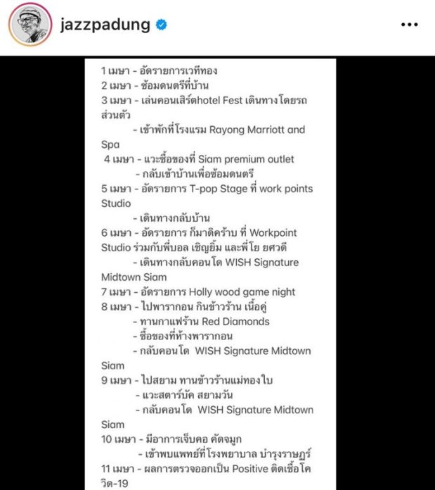 “และตอนนี้ผมกำลังเตรียมตัวเพื่อเข้ารับการรักษาที่โรงพยาบาล นี่คือไทม์ไลน์ทั้งหมดของผมในระยะเวลา 10 วันก่อนพบเชื้อโควิด-19 เพื่อให้บุคคลที่ใกล้ชิดผมในระยะเวลาตามไทม์ไลน์ได้รับทราบ สุดท้ายนี้ผมต้องขอโทษทุกคนที่ได้รับผลกระทบกับเหตุการณ์ในครั้งนี้ด้วยครับ🙏🏼”